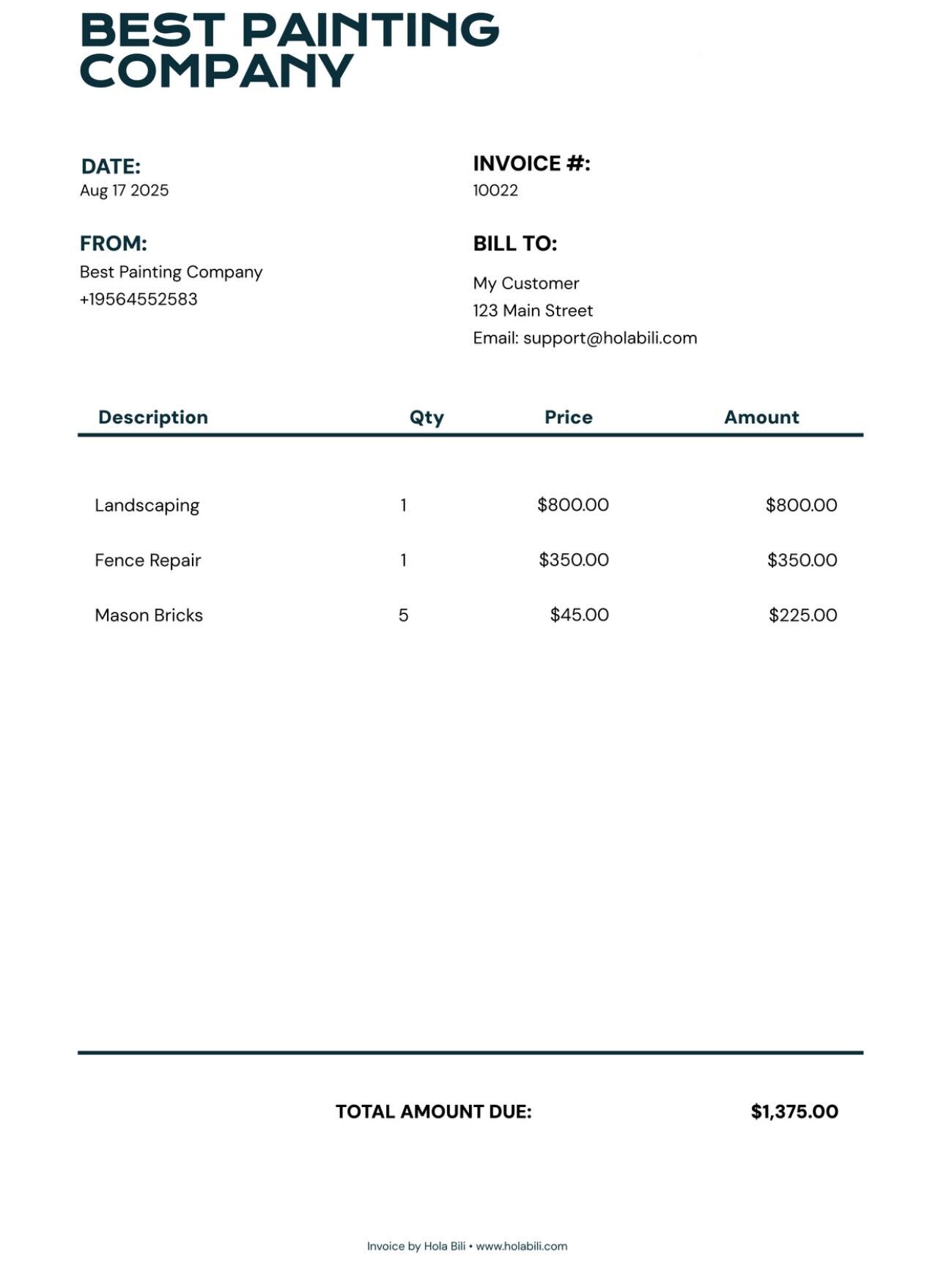 After you create an account, making invoices is as easy as texting us “Hola.” You add your client’s name, optionally their contact information, then our AI-powered system does the rest. You can just tell us what needs to go in the invoice: